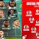 Arsenal: Arrizabalaga (5), White (5), Mosquera (5), Gabriel (5), Lewis-Skelly (5), Norgaard (5), Odegaard (5), Havertz (6), Dowman (7), Martinelli (5), Jesus (5)