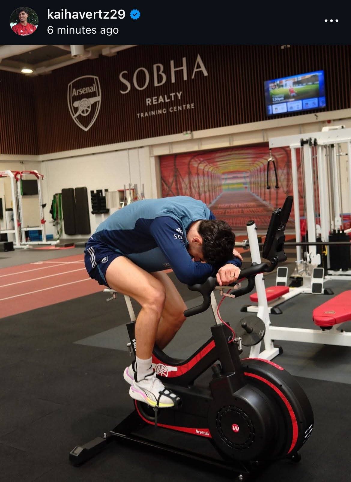 Kai Havertz has posted a new Instagram story from Arsenal’s Sobha Realty Training Centre, showing the German working on a stationary bike as he nears a return from injury. The image offers the clearest sign yet that his rehab has moved back into structured gym work at London Colney.