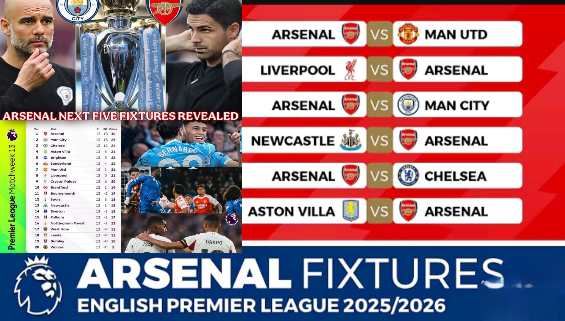 Arsenal next five Premier League fixtures compared to title rivals Chelsea and Man City