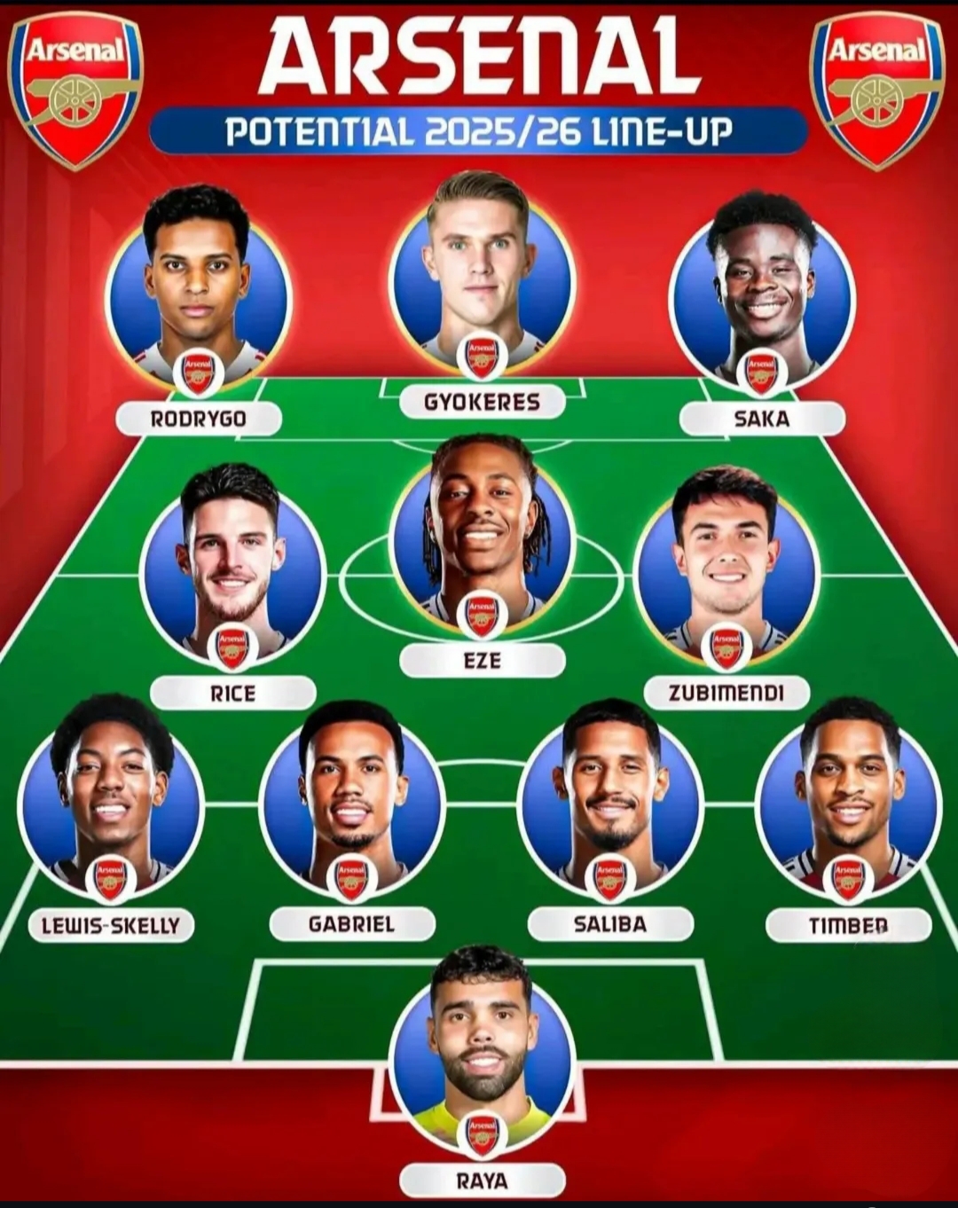 David Raya; Myles Lewis-Skelly, William Saliba, Cristhian Mosquera, Jurrien Timber; Eberechi Eze, Martin Zubimendi, Declan Rice; Bukayo Saka, Mikel Merino, Leandro Trossard