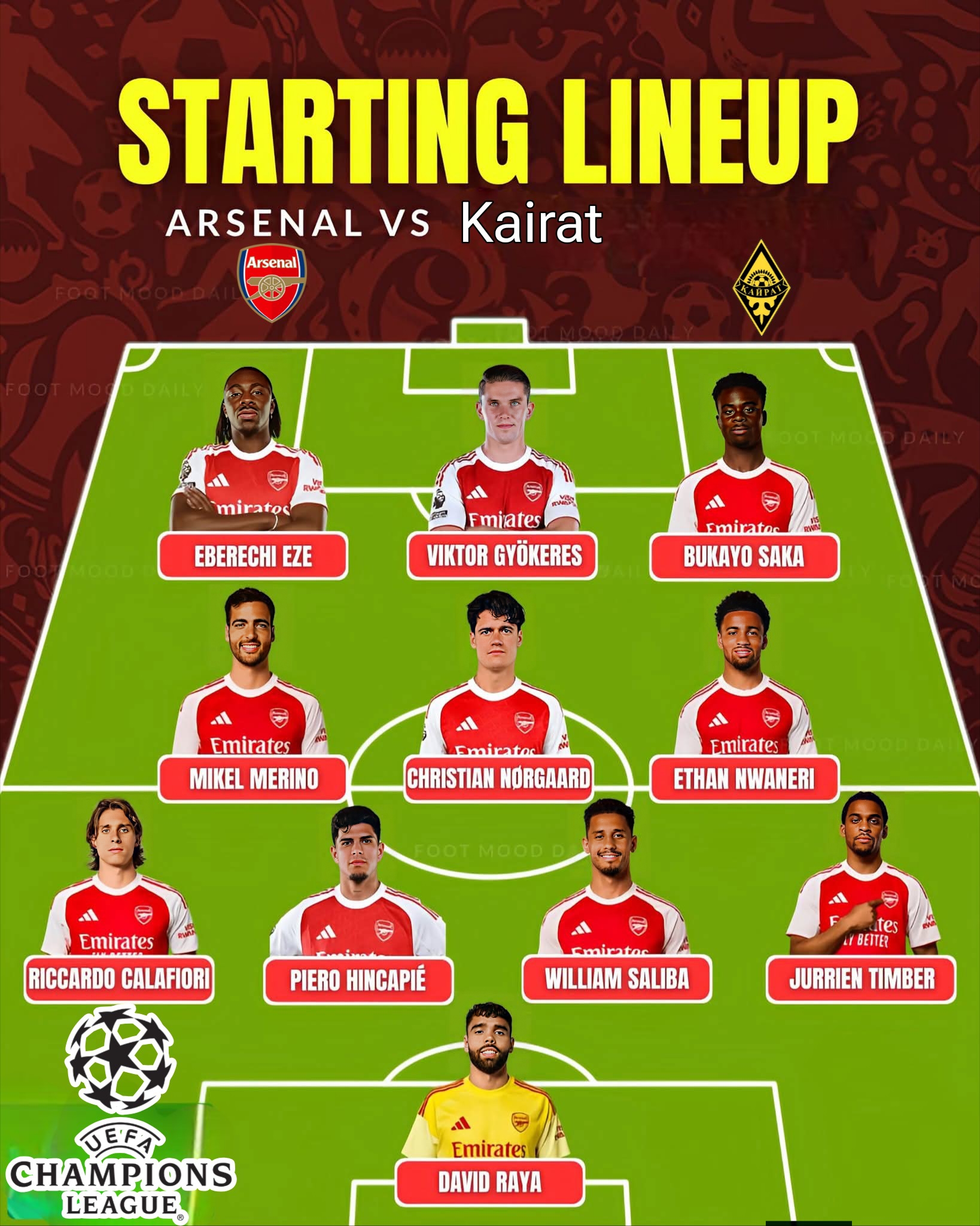 ST: Viktor Gyökeres—There remain question marks over Arsenal’s No.9 spot over the coming weeks and months now that Gabriel Jesus has returned and Kai Havertz is nearly back. The former started against United, meaning Gyökeres could come into the team against Kairat.