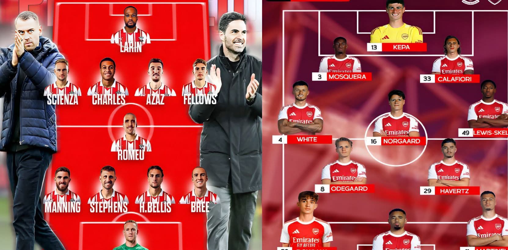 Arsenal: Arrizabalaga (5), White (5), Mosquera (5), Gabriel (5), Lewis-Skelly (5), Norgaard (5), Odegaard (5), Havertz (6), Dowman (7), Martinelli (5), Jesus (5)