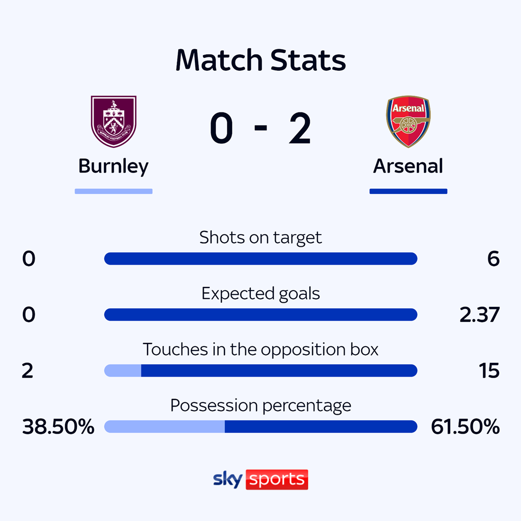 Burnley 0-2 Arsenal FULL TIME! Arsenal extend their lead at the top of the Premier League after easing to a 2-0 victory at Burnley.