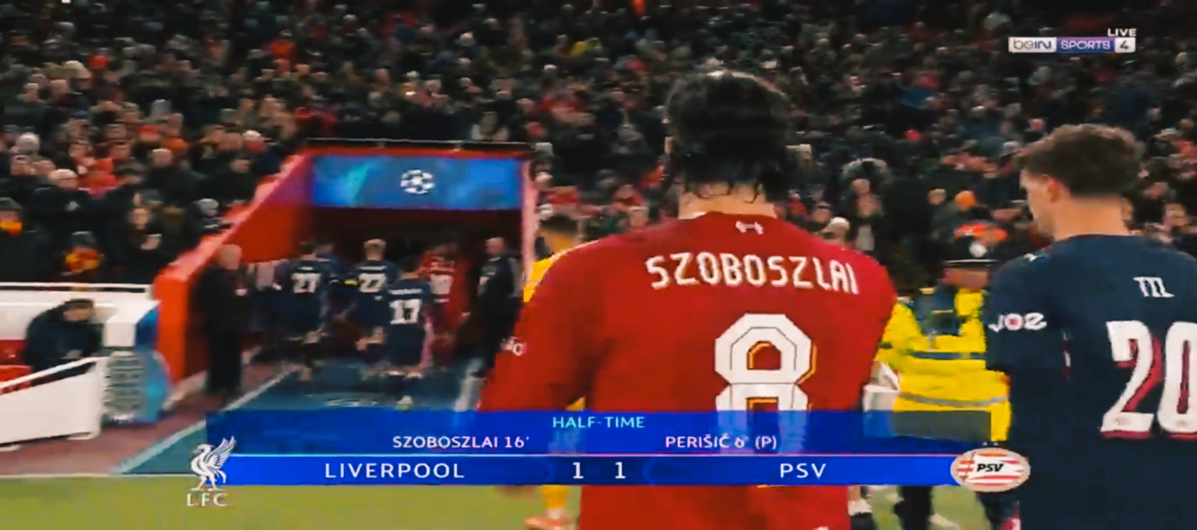 First Half: Liverpool 1-1 PSV Eindhoven Szoboszlai levels for Liverpool after Gakpo’s shot is parried View post