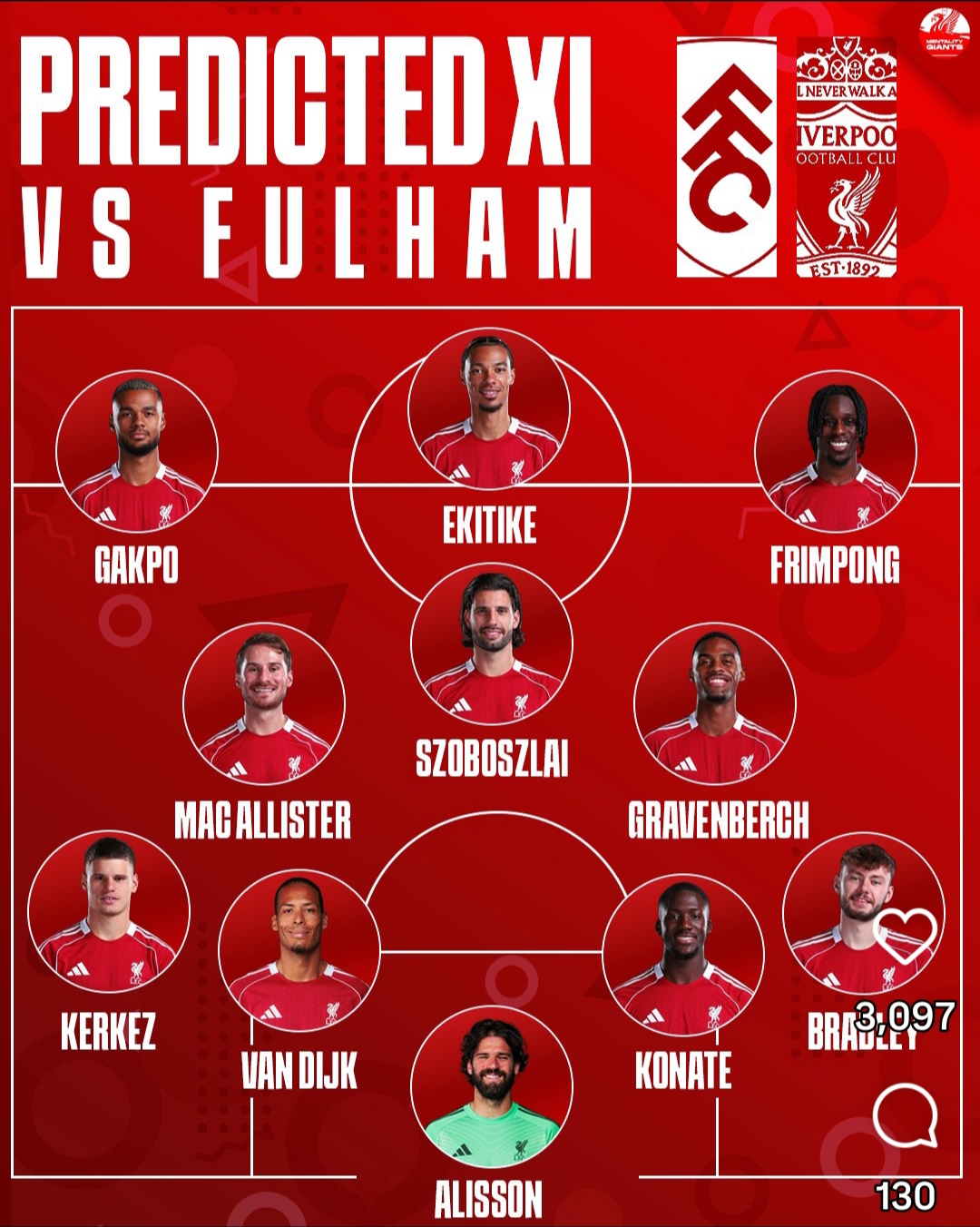 This lineup reflects the common prediction with Ekitike leading the attack in Salah’s absence, Szoboszlai and Gravenberch in midfield, and the new full-back pairing of Frimpong/Kerkez. Wirtz may be monitored for fitness and could be on the bench. �