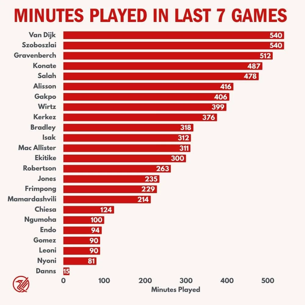 “Virgil van Dijk and Dominik Szoboszlai (540 mins) were the only two to play the full 90 minutes in every game, with the exception of one (Southampton in the Carabao Cup), with Ryan Gravenberch (512) not far behind.