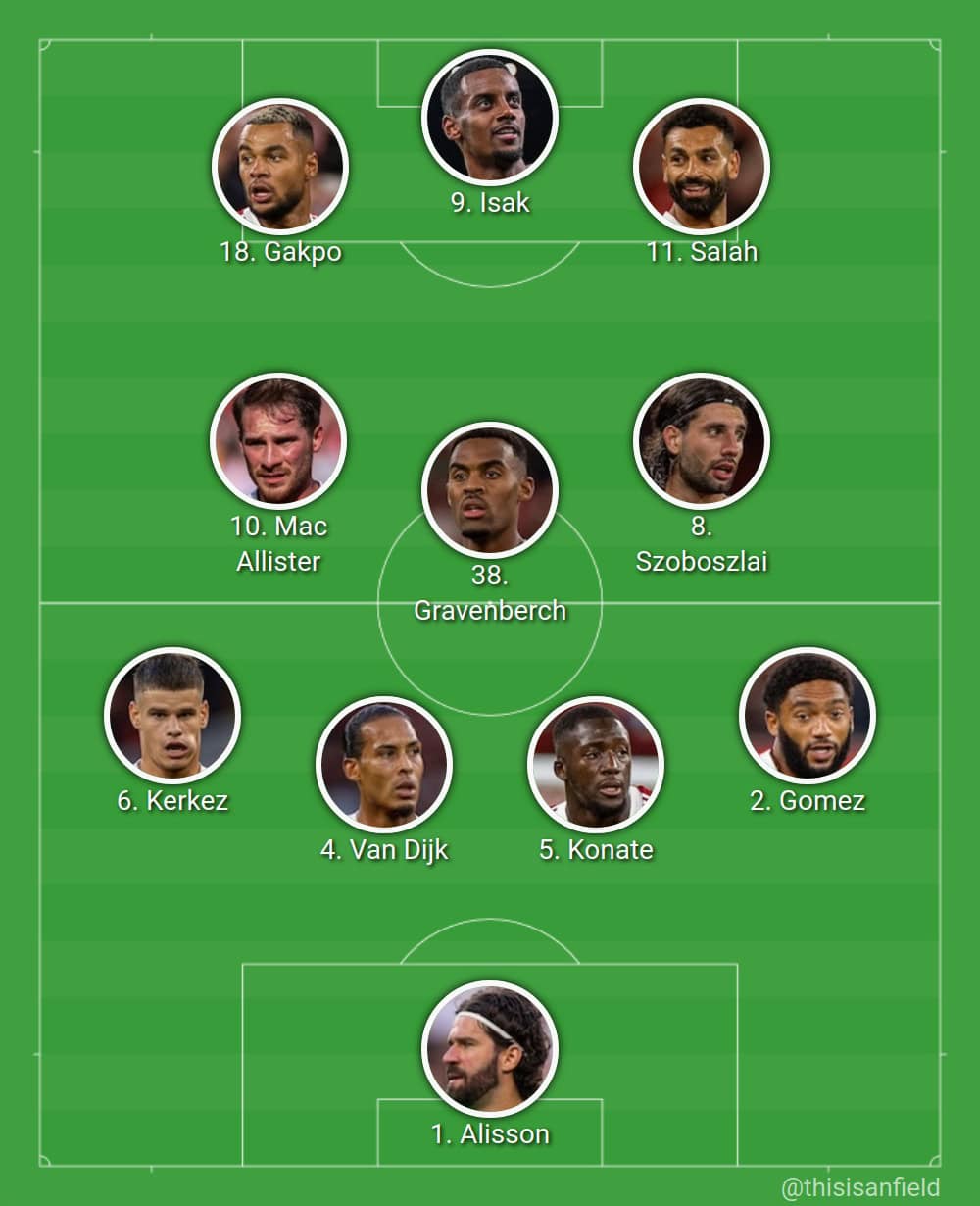 Alisson; Gomez, Konate, Van Dijk, Kerkez; Gravenberch, Szobozzlai, Mac Allister; Salah, Gakpo, Isak