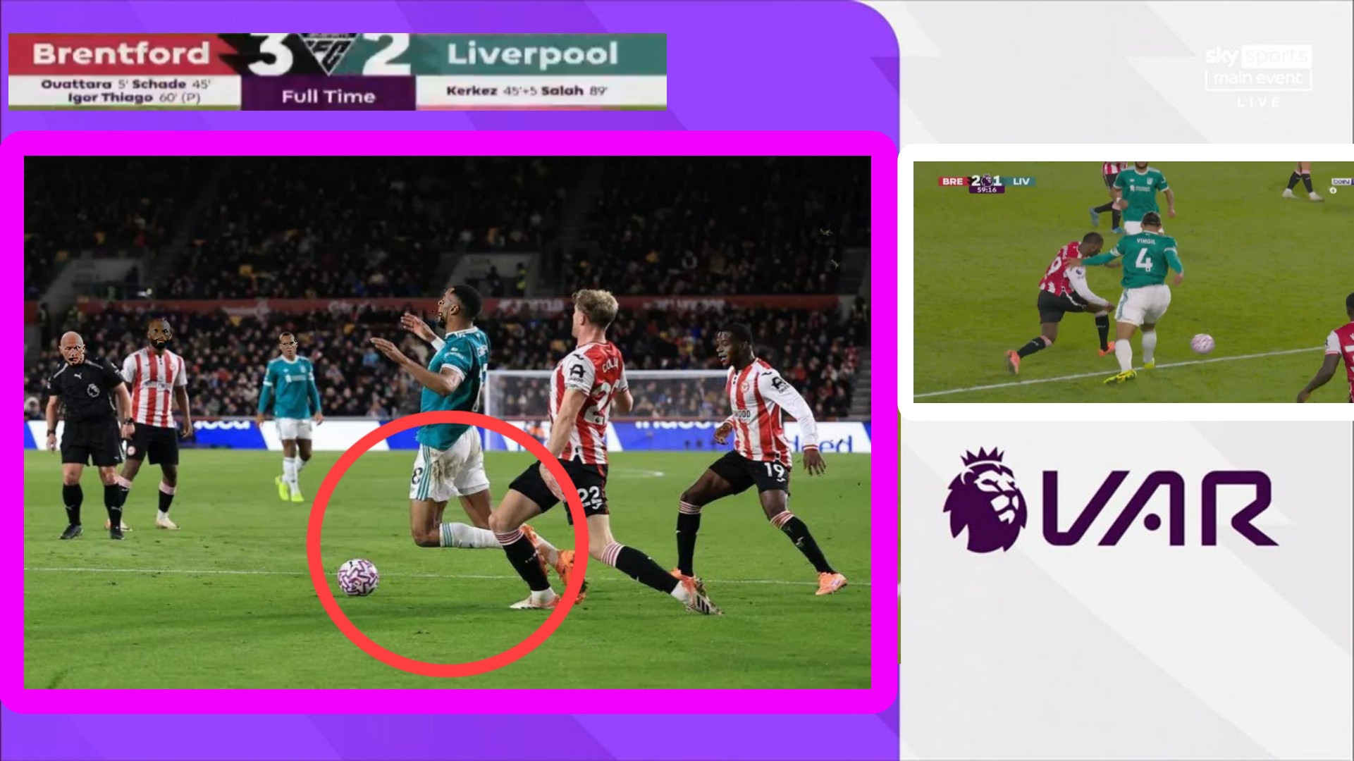 Milos Kerkez pulled one back before the interval to set up a dramatic second-half, with match referee Simon Hooper replaced by Robinson during the break after sustaining an injury in the first-half. The replacement official initially awarded Brentford a free-kick on the edge of the area following a challenge from Virgil van Dijk on Dango Ouattara.