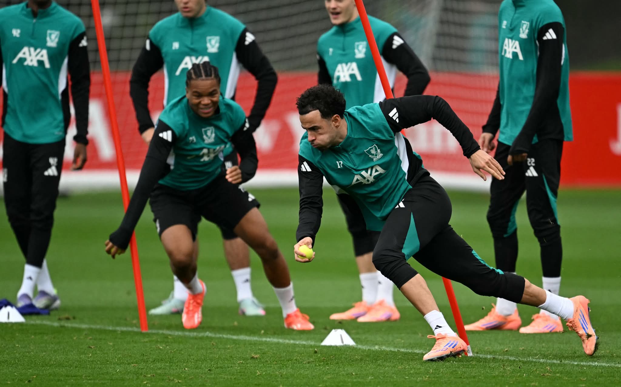 Liverpool’s English midfielder #17 Curtis Jones (R) and Liverpool’s English striker #73 Rio Ngumoha (L) compete during a sprinting exercise as they take part in a training session at the team’s training ground in Kirkby, north of Liverpool in northwest England, on October 21, 2025, on the eve of their UEFA Champions League league phase football match against Eintracht Frankfurt. (Photo by Oli SCARFF / AFP) (Photo by OLI SCARFF/AFP via Getty Images)