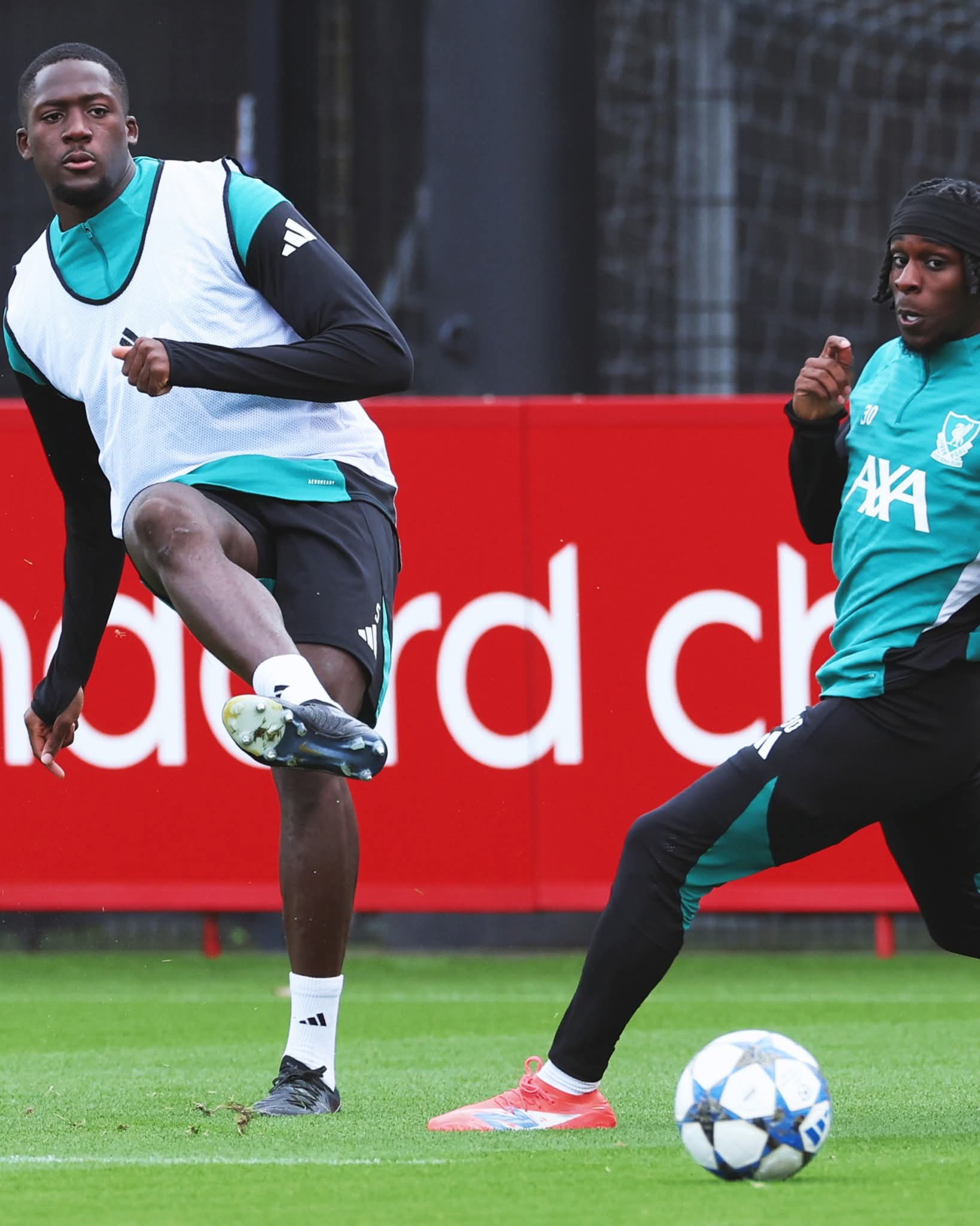 Liverpool’s English midfielder #17 Curtis Jones (R) and Liverpool’s English striker #73 Rio Ngumoha (L) compete during a sprinting exercise as they take part in a training session at the team’s training ground in Kirkby, north of Liverpool in northwest England, on October 21, 2025, on the eve of their UEFA Champions League league phase football match against Eintracht Frankfurt. (Photo by Oli SCARFF / AFP) (Photo by OLI SCARFF/AFP via Getty Images)
