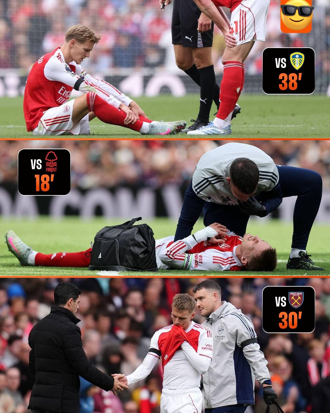 Odegaard has been forced off during the first-half of his last three Premier League appearances for the Gunners