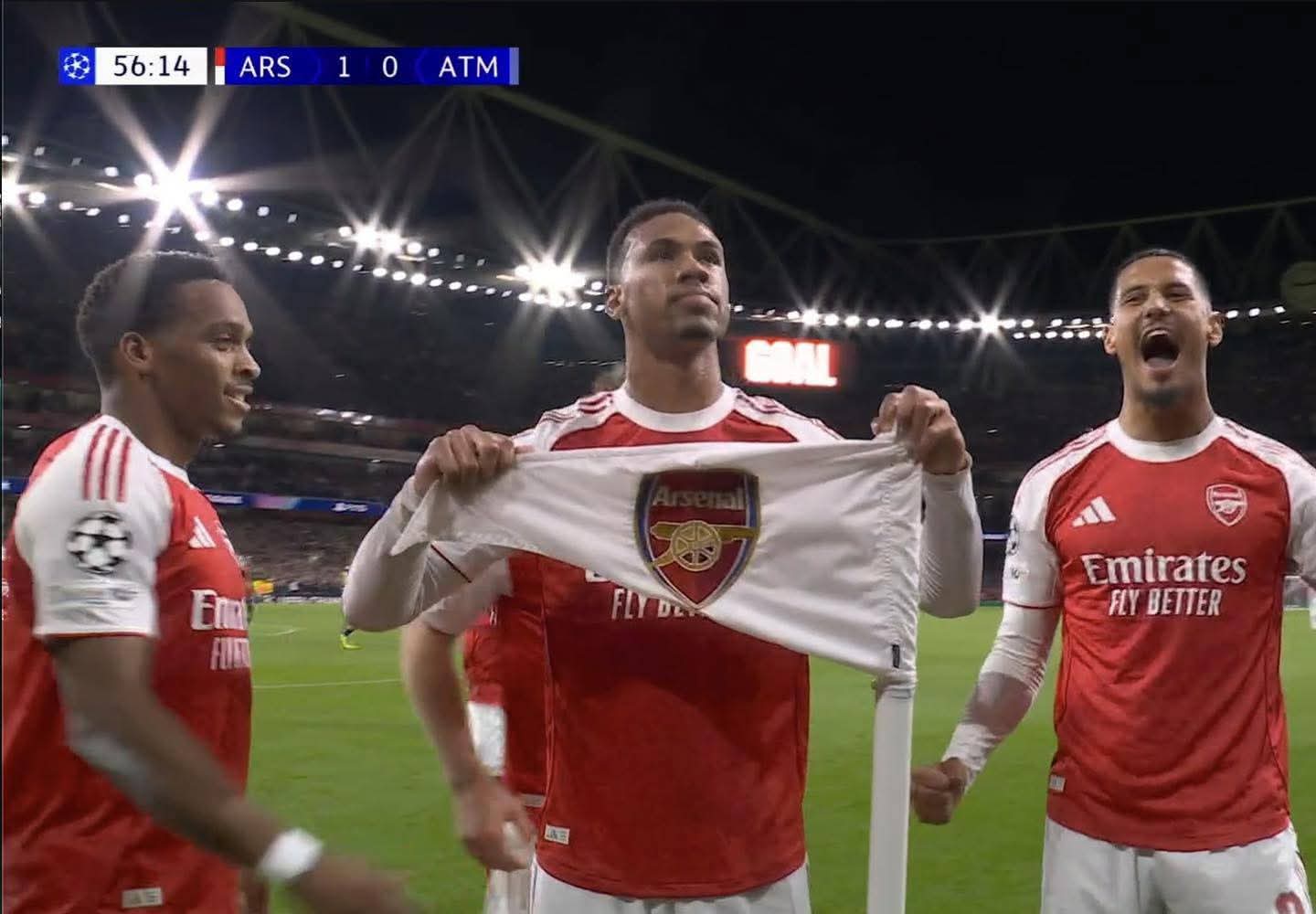 Gabriel celebrates scoring against Atletico Madrid