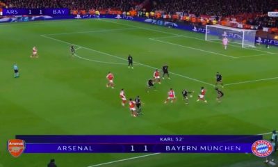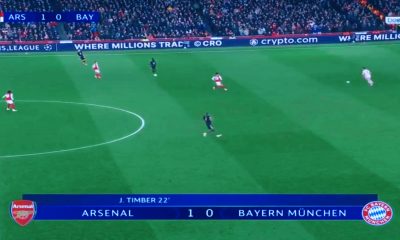 8: CHANCE? A first real attack from Arsenal. Merino lifts the ball over the top of the Bayern defence for Trossard, who looks offside....